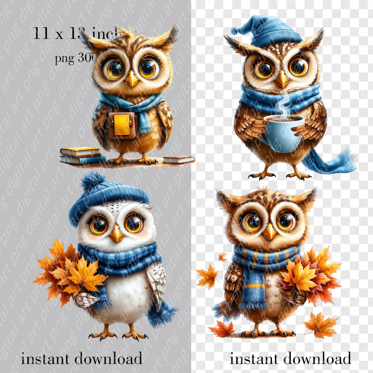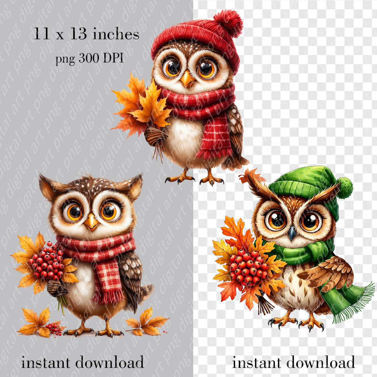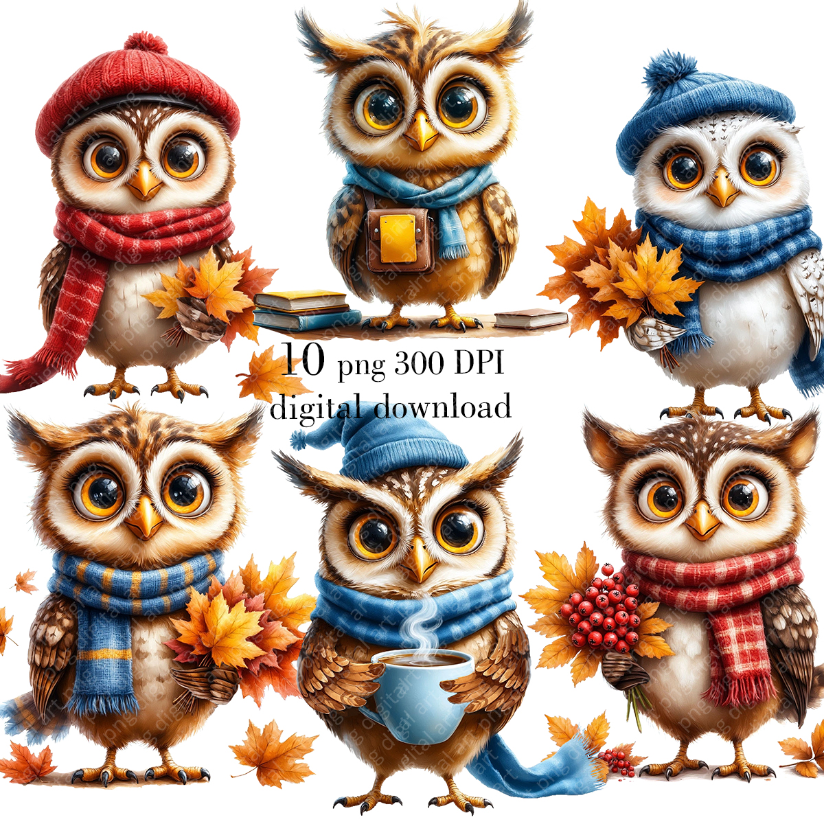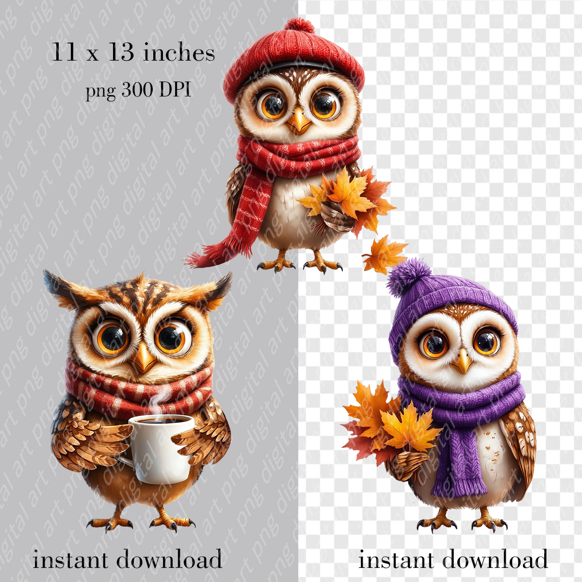 Embrace the cozy charm of autumn with this adorable clipart bundle featuring six whimsical owls! These cute owls are all dressed up in their fall best, sporting warm hats and scarves, and clutching seasonal goodies like fall leaves, berries, and hot beverages. This set is perfect for adding a touch of autumn magic to your creative projects. Each image is a high-resolution PNG file (300 DPI) with a transparent background, making them easy to use for a variety of designs.