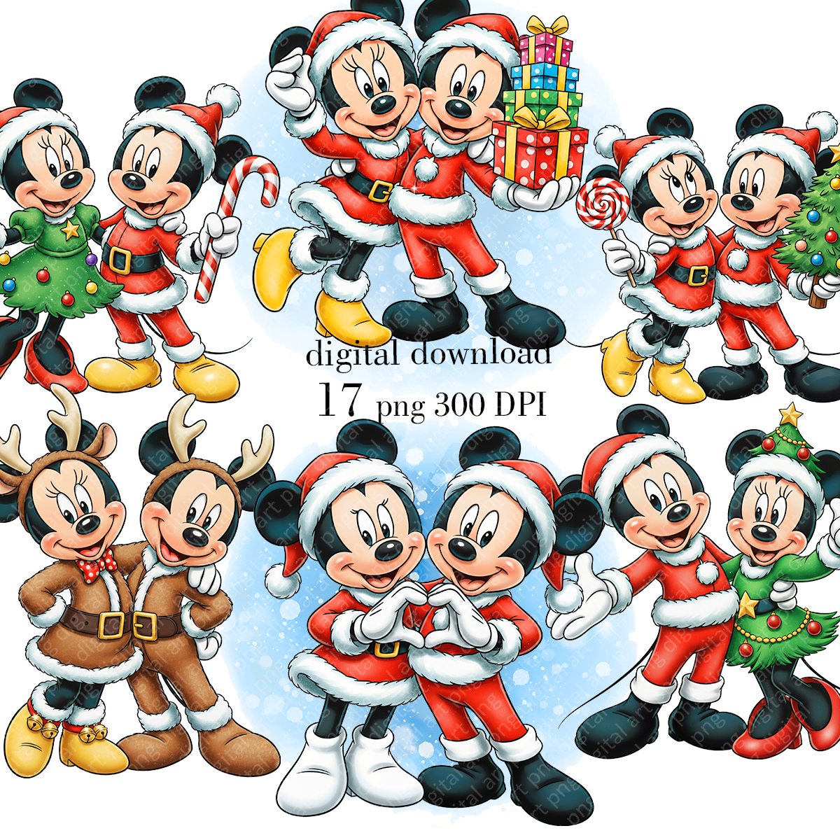 This festive, high-quality digital clip art bundle is perfect for adding a touch of Disney magic to all your holiday creations! Featuring beloved characters Mickey and Minnie Mouse in various Christmas and winter outfits, this set offers 17 individual PNG files with transparent backgrounds, all rendered at 300 DPI for crisp, clear printing and digital use.
