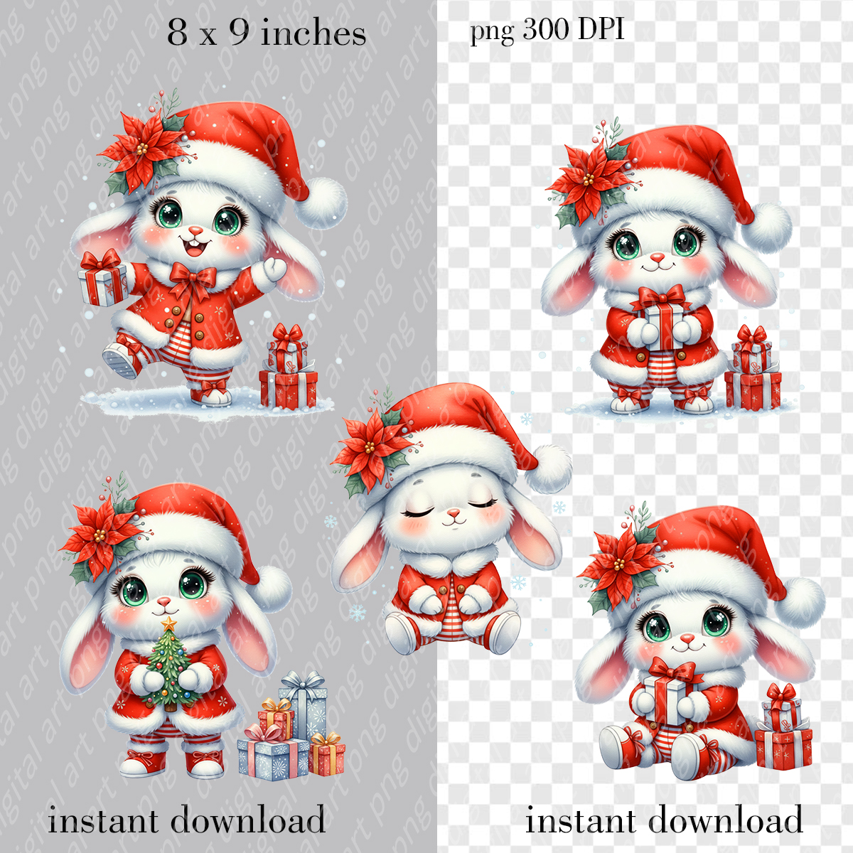 Bring a dash of cuteness and festive cheer to your winter and holiday projects with this enchanting collection of New Year’s Bunnies Clipart! This digital set features 10 unique, high-quality illustrations of sweet white bunnies dressed in cozy, detailed red and white Santa/New Year’s outfits, complete with poinsettia accents.