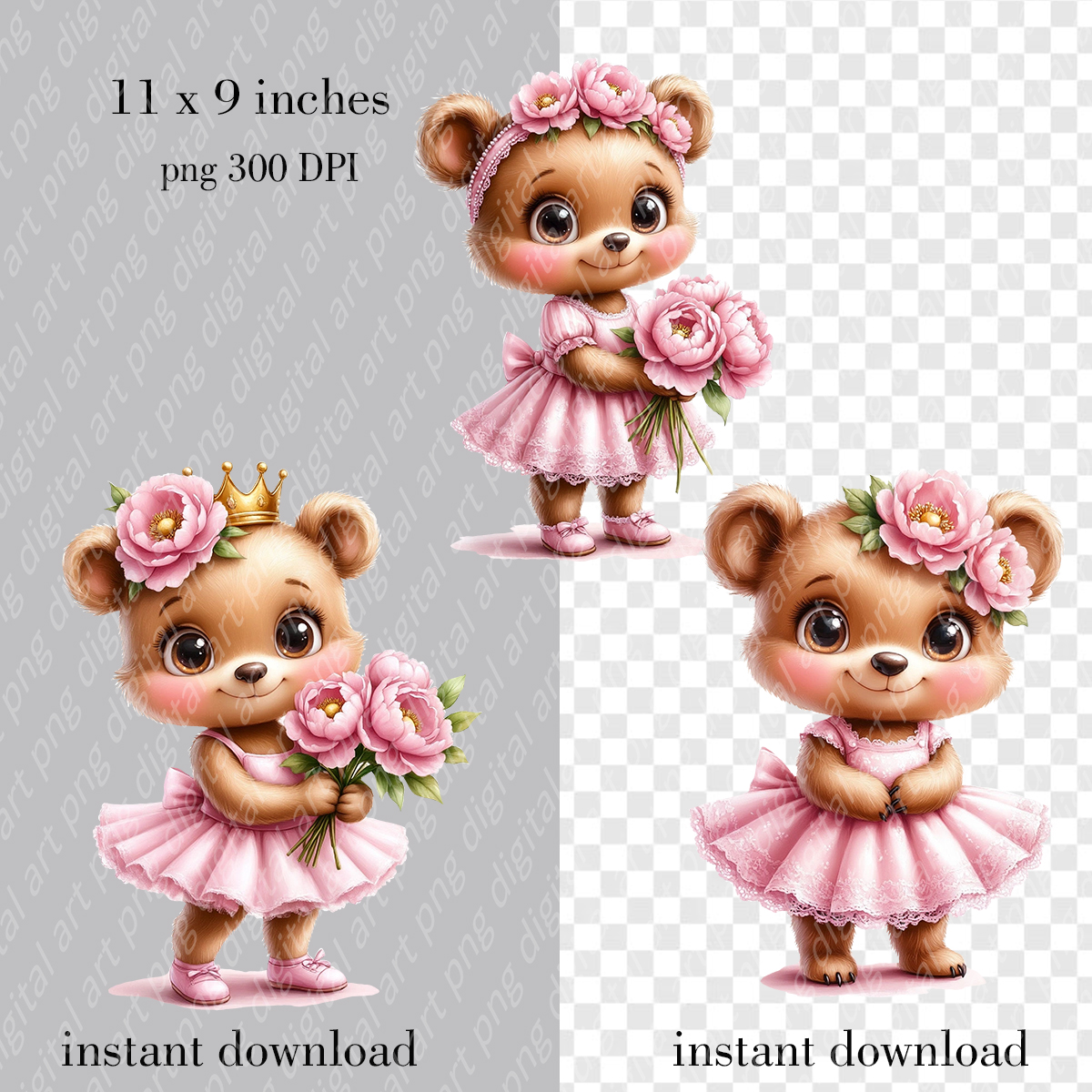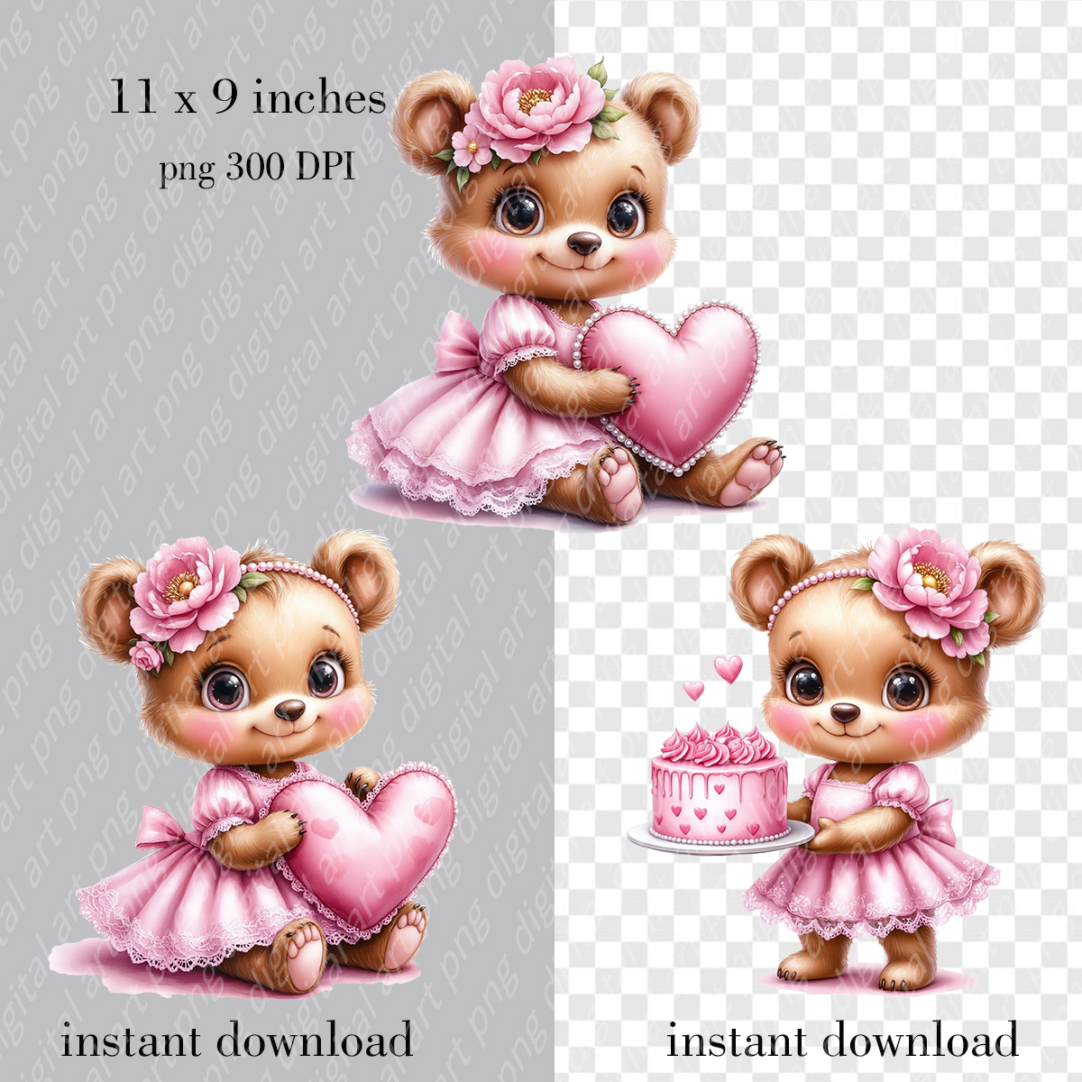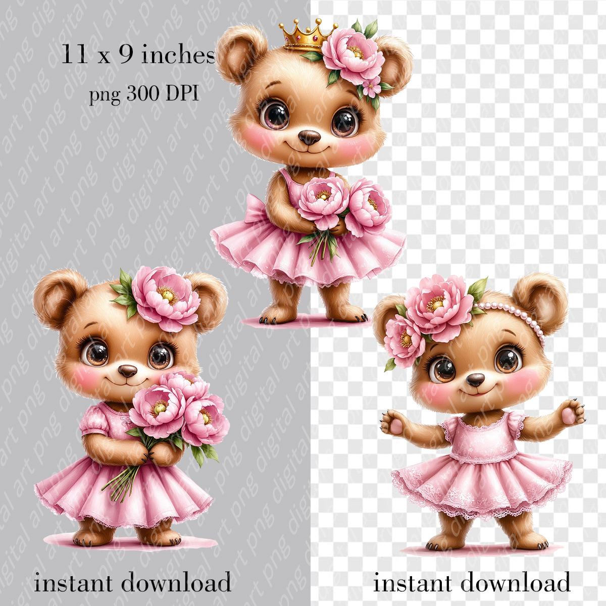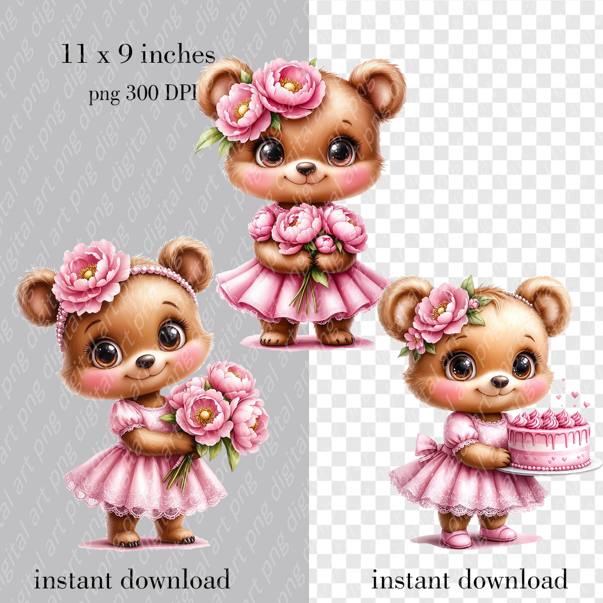 Add a touch of sweetness and charm to your projects with this adorable Teddy Bear Clipart Set! This collection features 12 unique illustrations of cute teddy bears dressed in pink dresses, adorned with beautiful floral accents. Perfect for creating invitations, cards, scrapbooking layouts, party decorations, and more!