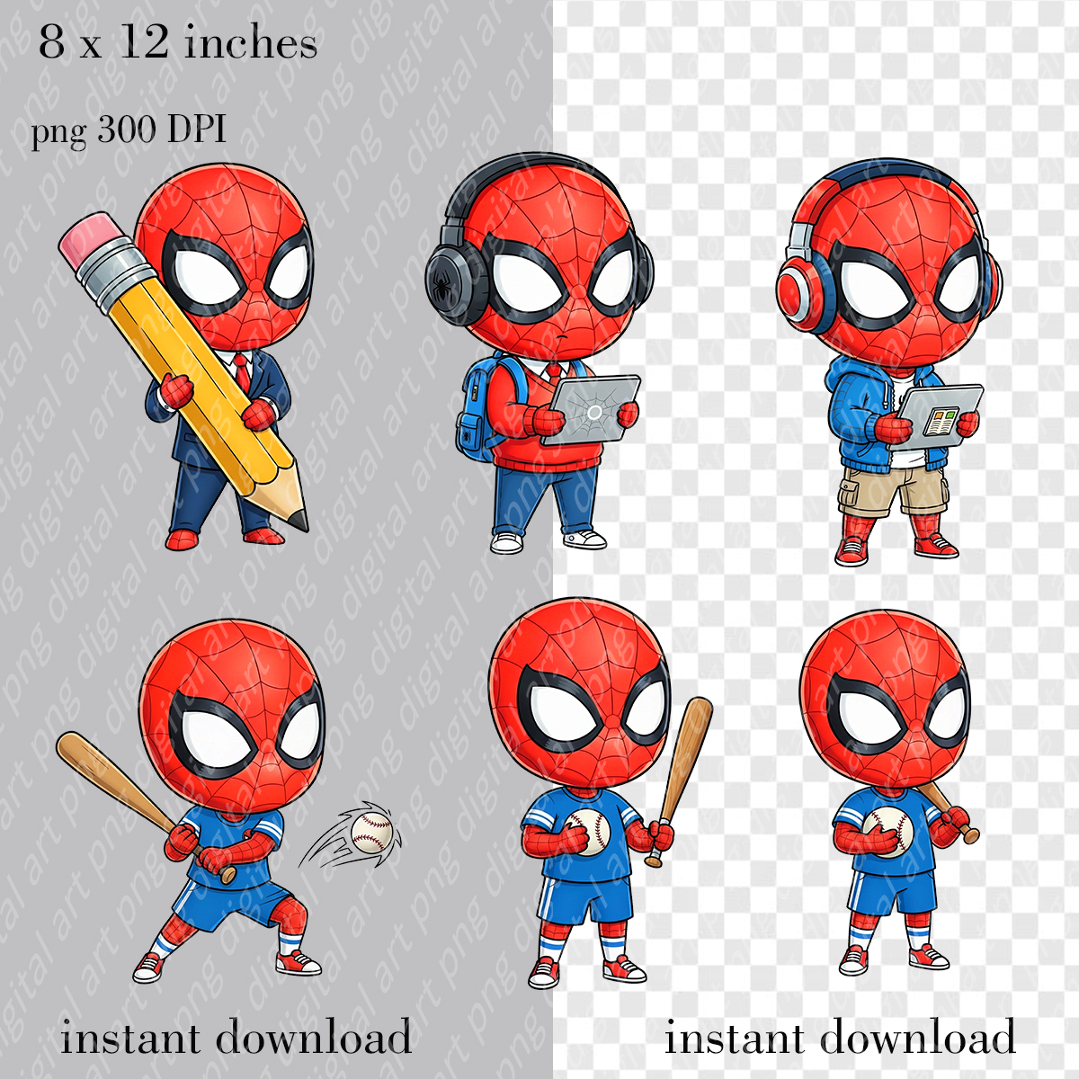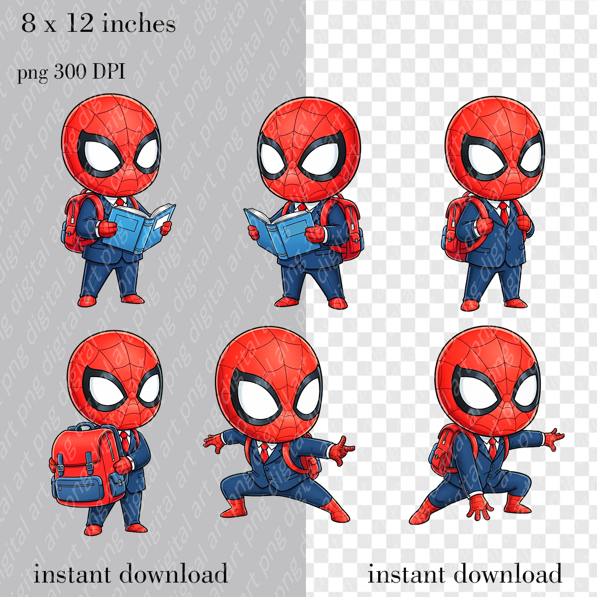 Swing into the school year with this adorable set of Spider-Man School Clip Art! This collection features a cute, chibi-style Spider-Man in various school-related poses. Perfect for teachers, parents, and craft enthusiasts, these high-quality PNG files are ready to add a touch of superhero fun to your projects.